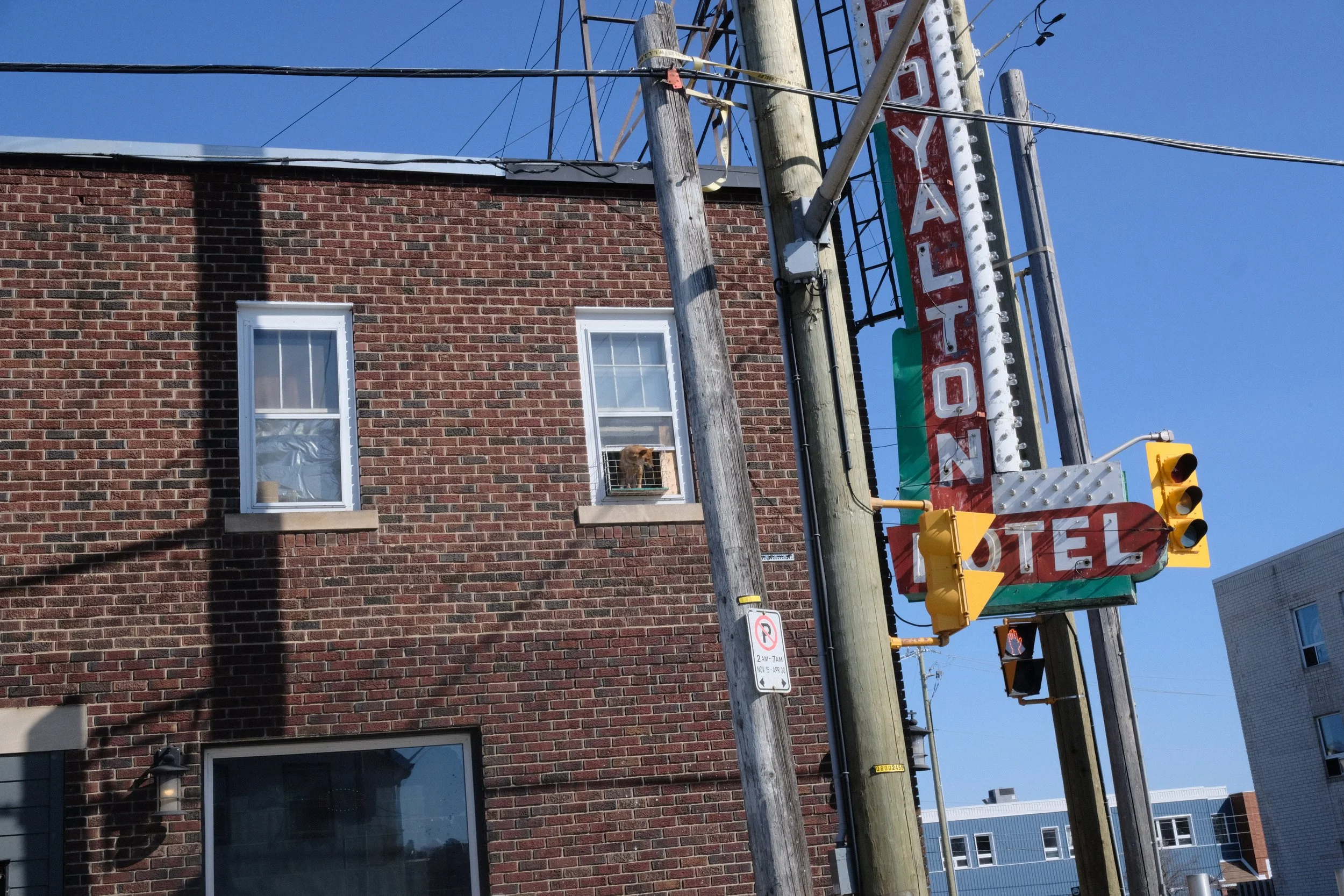 A dog looking out a second floor apartment window in Thunder Bay, ON