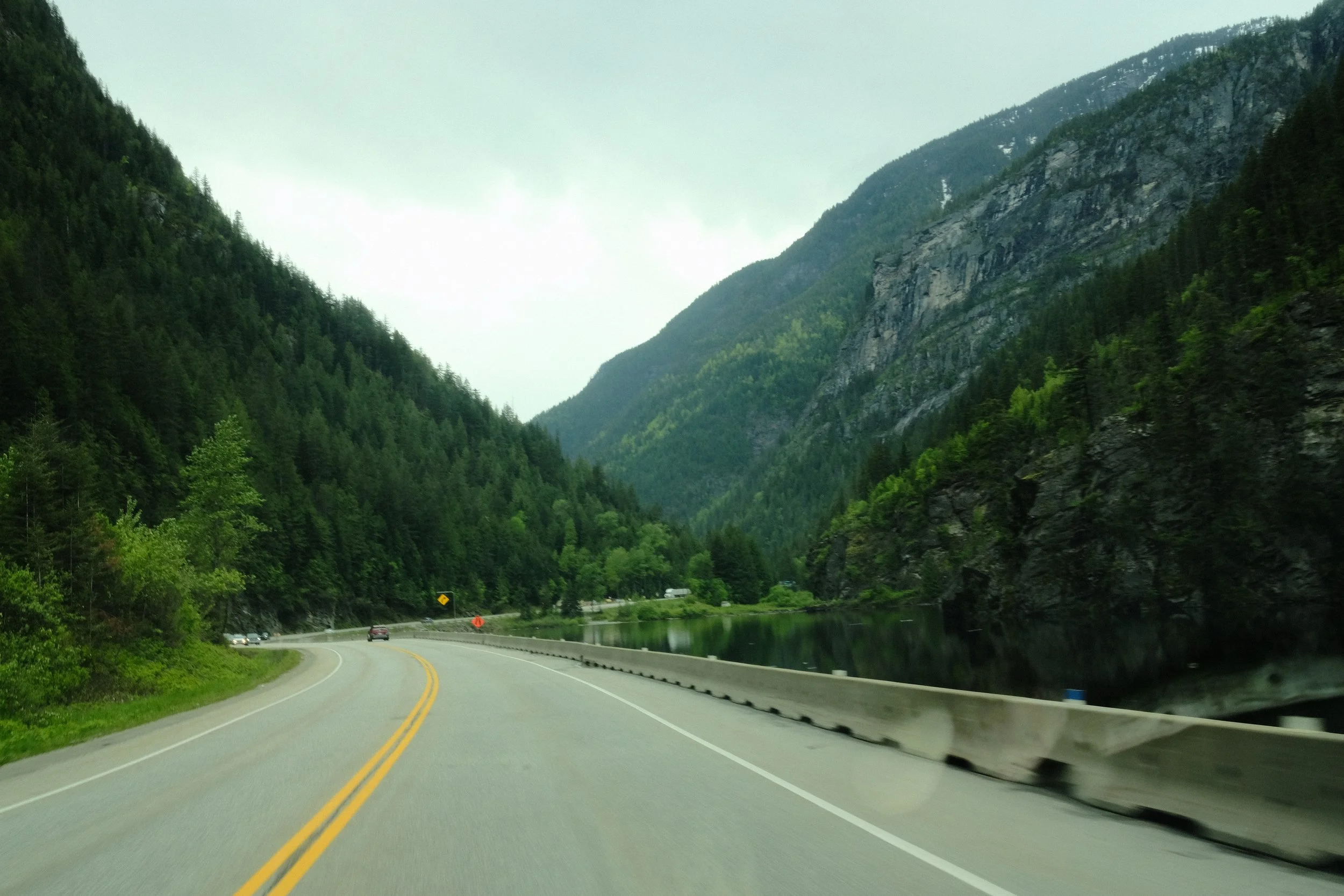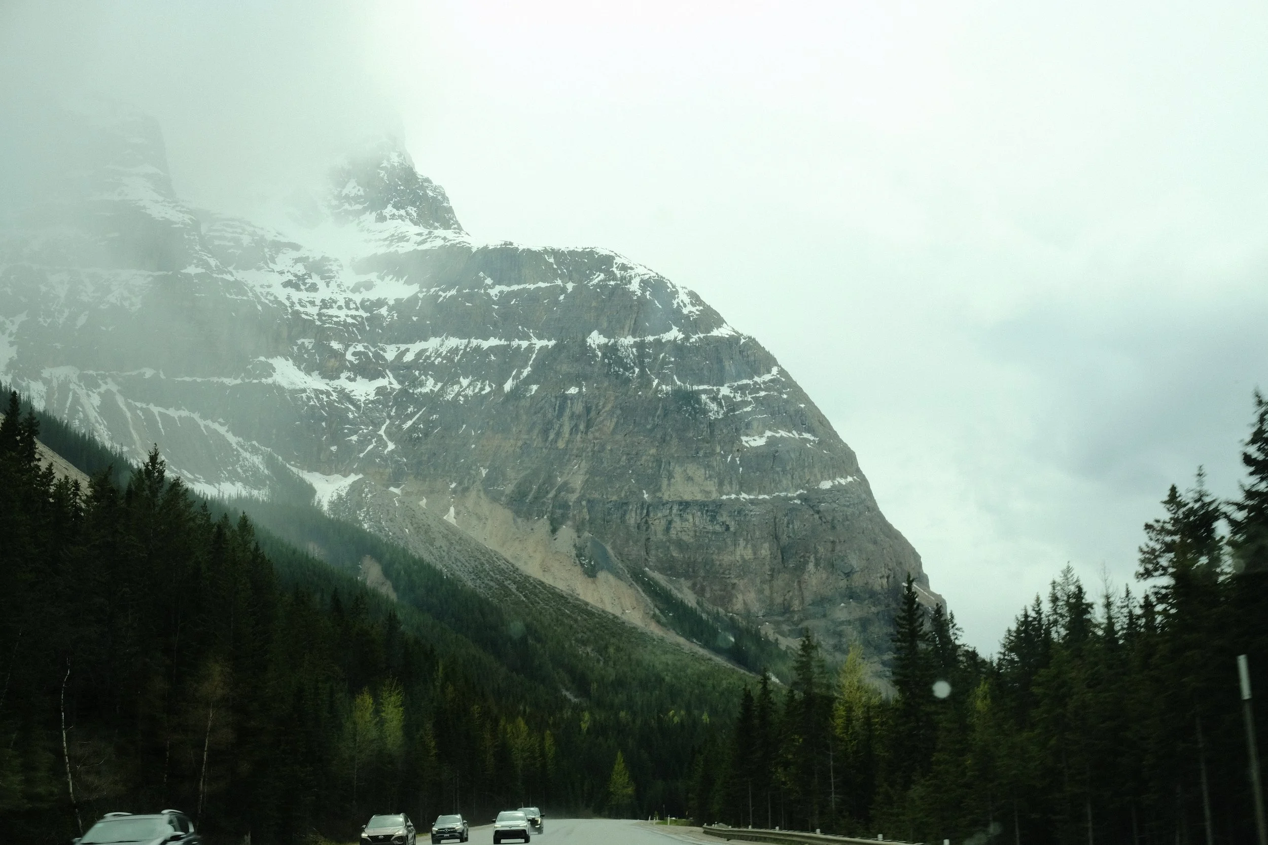 Some light rain, some fog, some sun. I had all the weather except snow over the Kicking Horse Pass.
