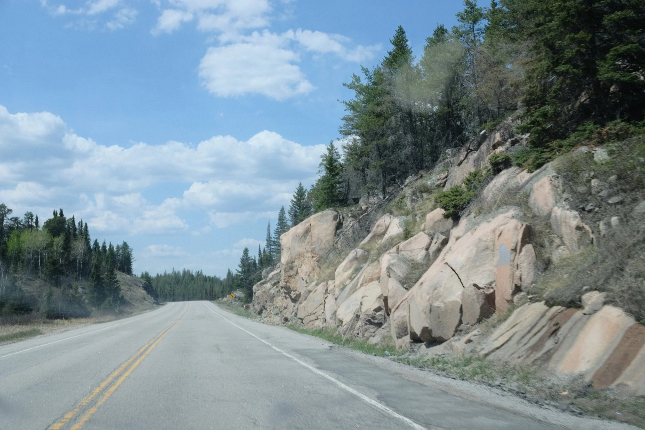 I stopped in Dryden at the ‘you know where’ and got a cup of coffee and used the wifi to write yesterdays blog post. Soon after opening my laptop a fellow in biker gear sat down on the couch next to me. “Are you a writer?” I faltered a little at that question, uhhhhh, I hadn’t really thought about it. I told him I was more of a ‘documenter’. His name was Dave, an ex school teacher, we got into an easy conversation about the places I’ve been and where I’m headed, he was a wealth of information. He had just picked up a new to him motorcycle in Thunder Bay and was heading to Winnipeg, deciding whether he was going to choose the longer curvier road on his bike or the straight shot faster way. He said he wished more Canadians would do what I was doing, get out and go places so they could discover how great and varied Canada is for themselves. He gave me a few tips for a things to see and places to go, he was right about the town of Vermillion being a ‘treat’ because of the geology there, the exposed granite and granite quarry’s showing off the bright pinks, whites and shades in-between at the roadside cut-aways and lake edges. So pretty. I tried to snap a pic of the road side striping and failed.